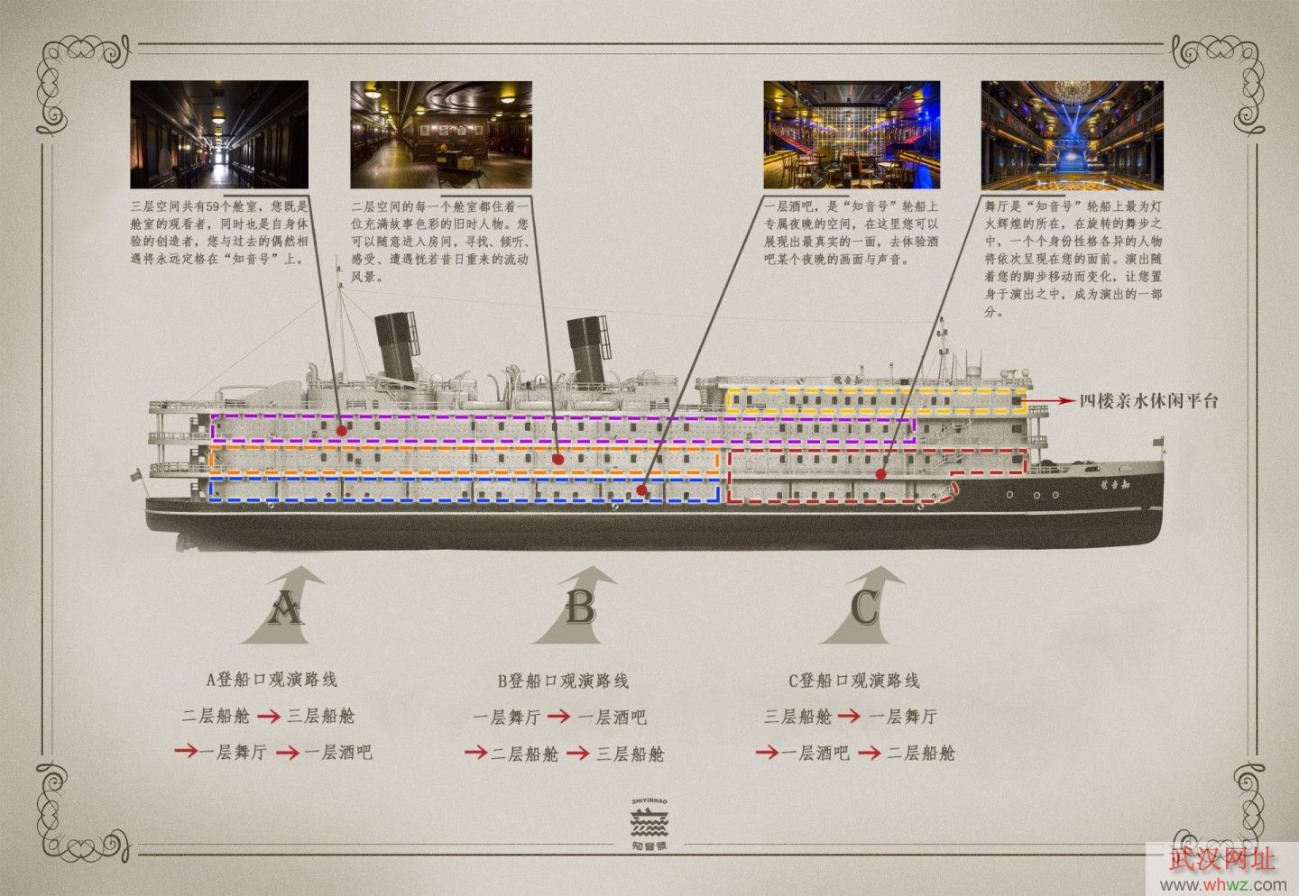 為使游客有更好的觀演體驗,《知音號》分為A、B、C三個登船口進(jìn)入“知音號”內(nèi),三條路線入口和路線不同但觀看內(nèi)容是相同的。