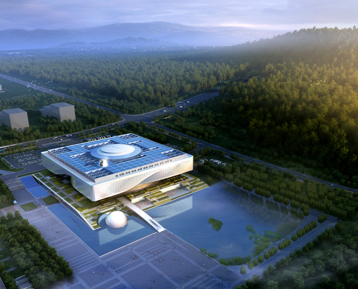 新館建筑外形為一個(gè)富有湖北元素的巨大活字創(chuàng)想造型,整個(gè)建筑將科技館大廳處理為圓形,以活字拼接為主題的展廳設(shè)計(jì)為方形的空間,兩個(gè)空間通過旋轉(zhuǎn)的外形銜接,運(yùn)用自然界中廣泛存在的黃金對(duì)數(shù)螺旋連接圓形的大廳與代表活字印刷的方形展示空間,整個(gè)建筑又像電腦的芯片,寓意光谷之芯,從而完整體現(xiàn)出時(shí)間和空間的交融、科技與未來的連接,呈現(xiàn)出動(dòng)態(tài)的科技美感。為體現(xiàn)湖北千湖之省的美譽(yù),結(jié)合城市公共空間與廣場水景的設(shè)計(jì),球幕影院依臺(tái)傍水,局部似凌駕水面,水波浮影,營造出科技與人文交織的空間意趣。